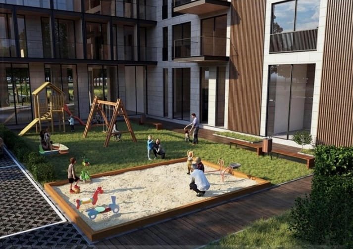 A recreation area with comfortable benches and gazebos is provided. For those who lead an active lifestyle, a multi-purpose sports area with pull-up bars and other outdoor exercise equipment will be installed. Territory lighting is provided by modern street lamps, ensuring comfortable walking conditions even during nighttime.