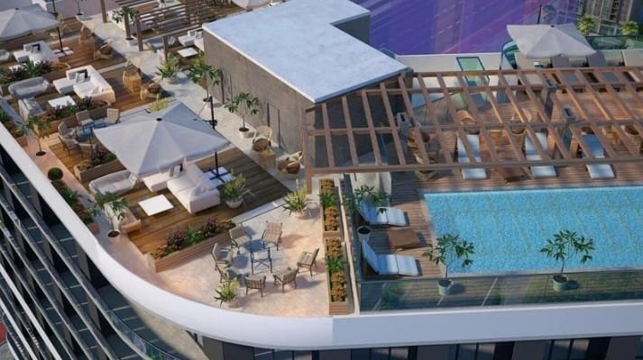 On the exploited roof of the high-rise building, there is a spacious terrace with an outdoor pool, a bar and comfortable seating areas.