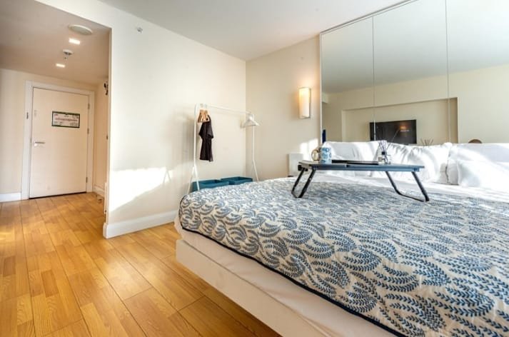 Floor lamp laptop table coffee table clothes hanger large mirrored wardrobe up to the ceiling.