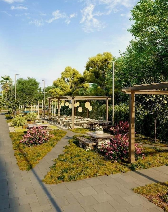 The landscaping consists of decorative plants, trees, and flower beds. Near the new building, driveways and pedestrian paths are covered with paving tiles.