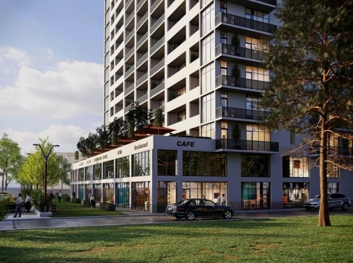 The lower floor is reserved for commercial premises such as cafes, pharmacies, shops, and more.