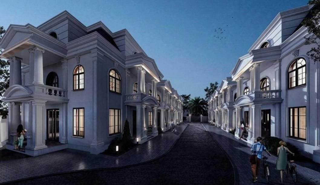The complex stands out for its distinctive architecture. The houses are designed in a classic European style with columns and arched windows. The dark grey tiled roof juxtaposes the white façade. The complex includes two three-storey buildings or, more specifically, two rows of townhouses. This arrangement allows residents to have their own entrances, a plot of land, and a feeling of spaciousness that comes with a three-storey home. The only downside is that there might be two neighboring houses on the sides.