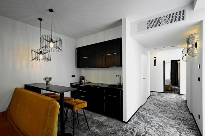 The owners of the apartments and guests of the complex can relax on a private beach with black magnetic sand and comfortable sun loungers. The driveways and pedestrian paths are arranged near the houses, and the landscape garden is made with planted trees, ornamental shrubs and lawns.