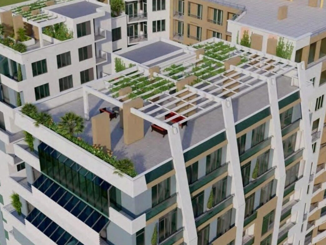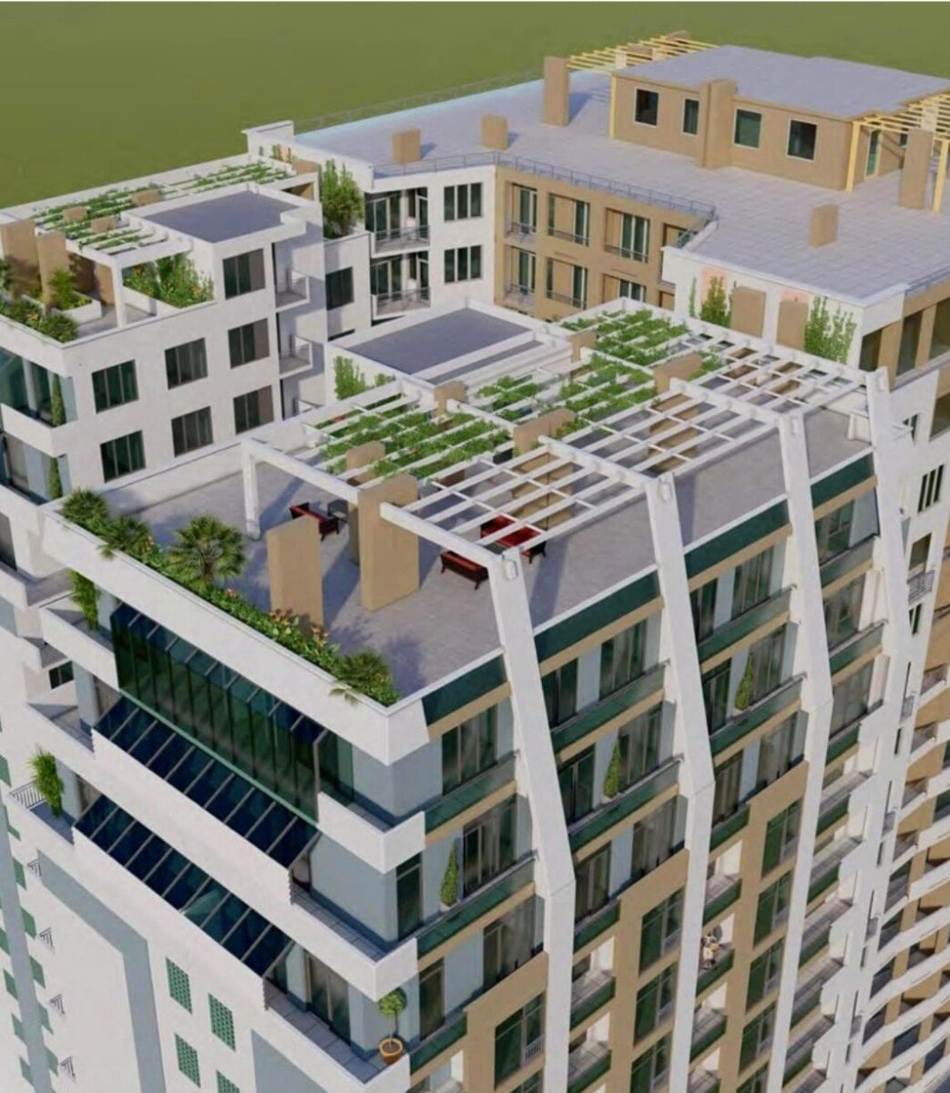 The modern design includes ventilated façades finished with Reynobond energy-efficient aluminum panels, open balconies, and high-quality metal-plastic windows. Both buildings feature usable rooftops with private terraces.