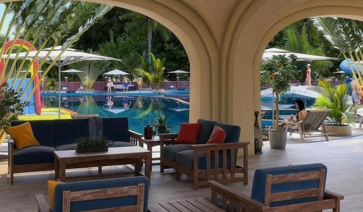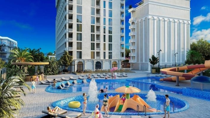The complex comes with a well-thought-out landscaped recreation zone and a garden placed on the 10th floor. There is also a seawater swimming pool with slides and chaise lounges.