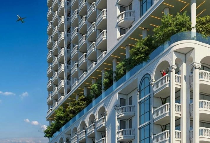 The project is designed in the classical architectural style. The distinguishing feature of the complex is a garden placed on the 10th floor that cuts the building in half. The facade, open balconies, arches, pillars, and balustrades bring out an air of sophistication in the architecture and add some magnificence to the building.