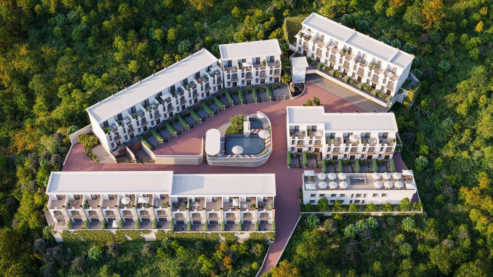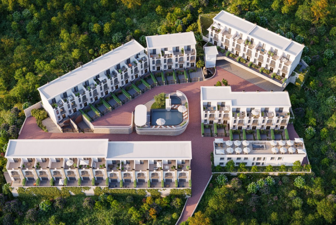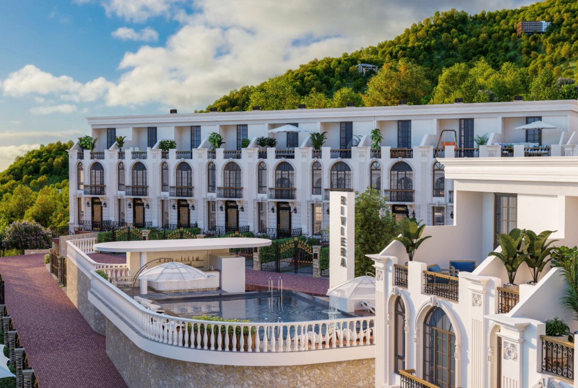 The project includes 40 premium townhouses, constructed with energy-efficient materials that provide excellent sound and heat insulation. The townhouses feature modern European architecture, full-height stained-glass windows, open terraces, and elegant exterior details such as pilasters and arched windows.